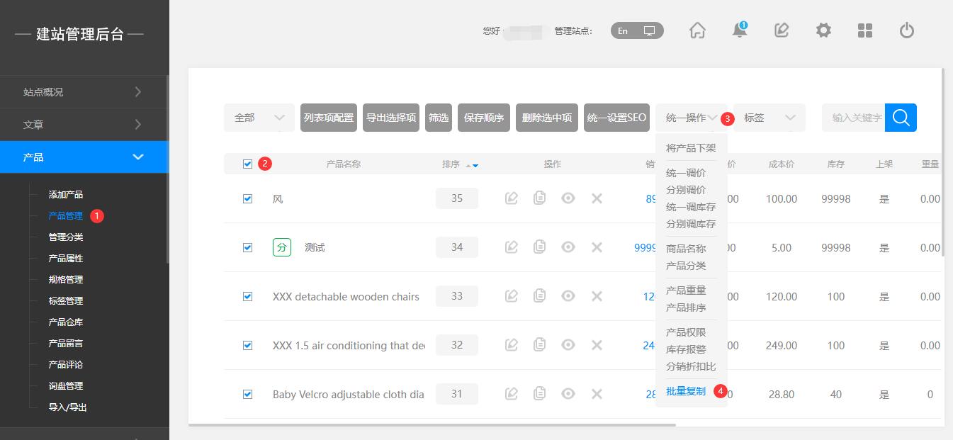 后台:产品 — 产品管理 — 选择产品 — 统一操作 — 批量复制 — 选择语言站点